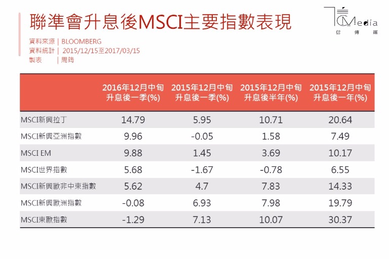 觀察2004年6月底、2015年12月中、2016年12月中升息一季後,MSCI新興亞洲指數與MSCI世界指數表現分別為18.8%及10.1%、-0.05%及-1.67%、9.96%及5.68%,換言之,FED升息間隔越長,將越有利新興市場股市。