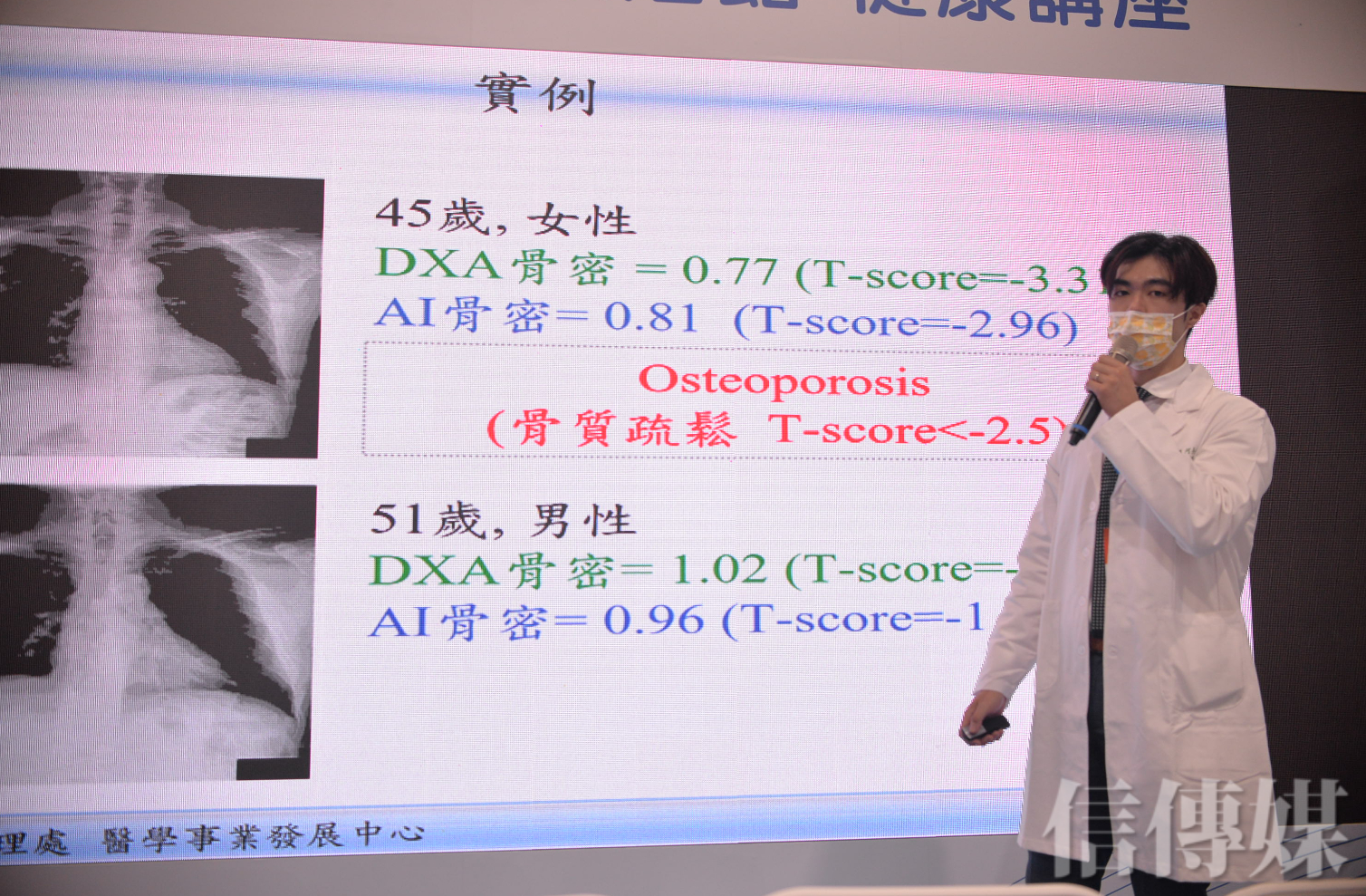 台塑集團透過「人工智慧篩檢X光影像之骨質疏鬆風險」計畫,將AI技術應用於胸部X光照影進行深度學習,即可直接透過一般胸部X光片,擷取骨質密度變化特徵,立即推論出個人骨質疏鬆風險。