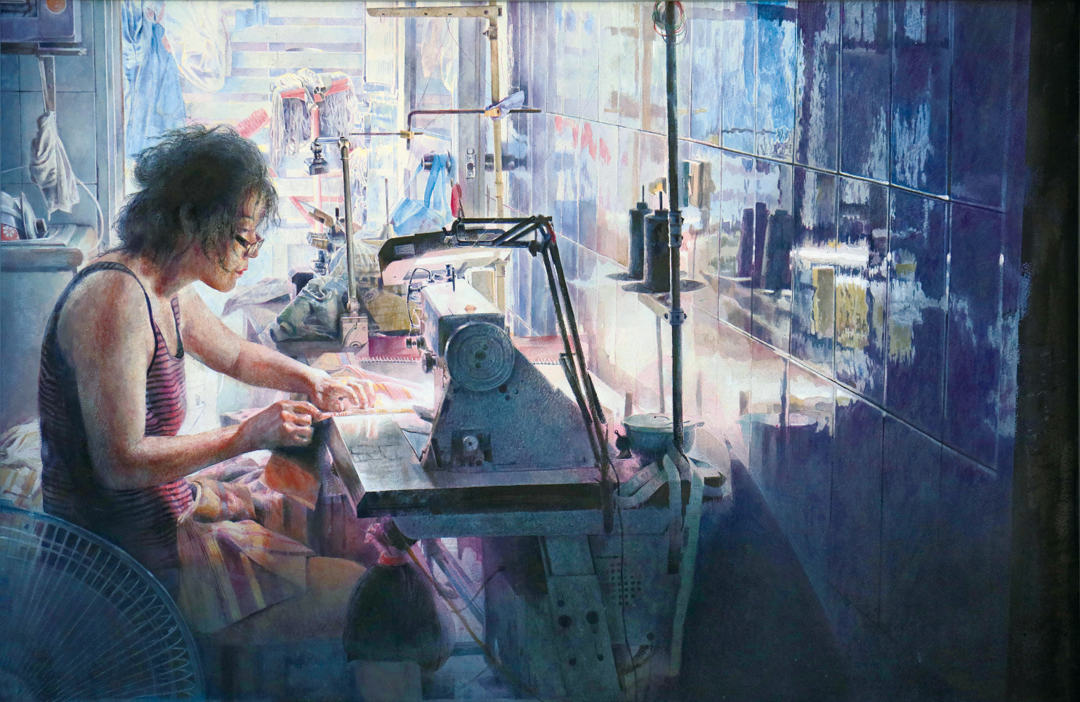 該作品描繪早起的母親為了省電,在廚房開著小檯燈挨著晨光工作的神態,微弱的光線,彷彿可以聽到電扇的微風穿過裁縫車的聲音,母親辛勤工作畫面讓他覺得最美、最動人。