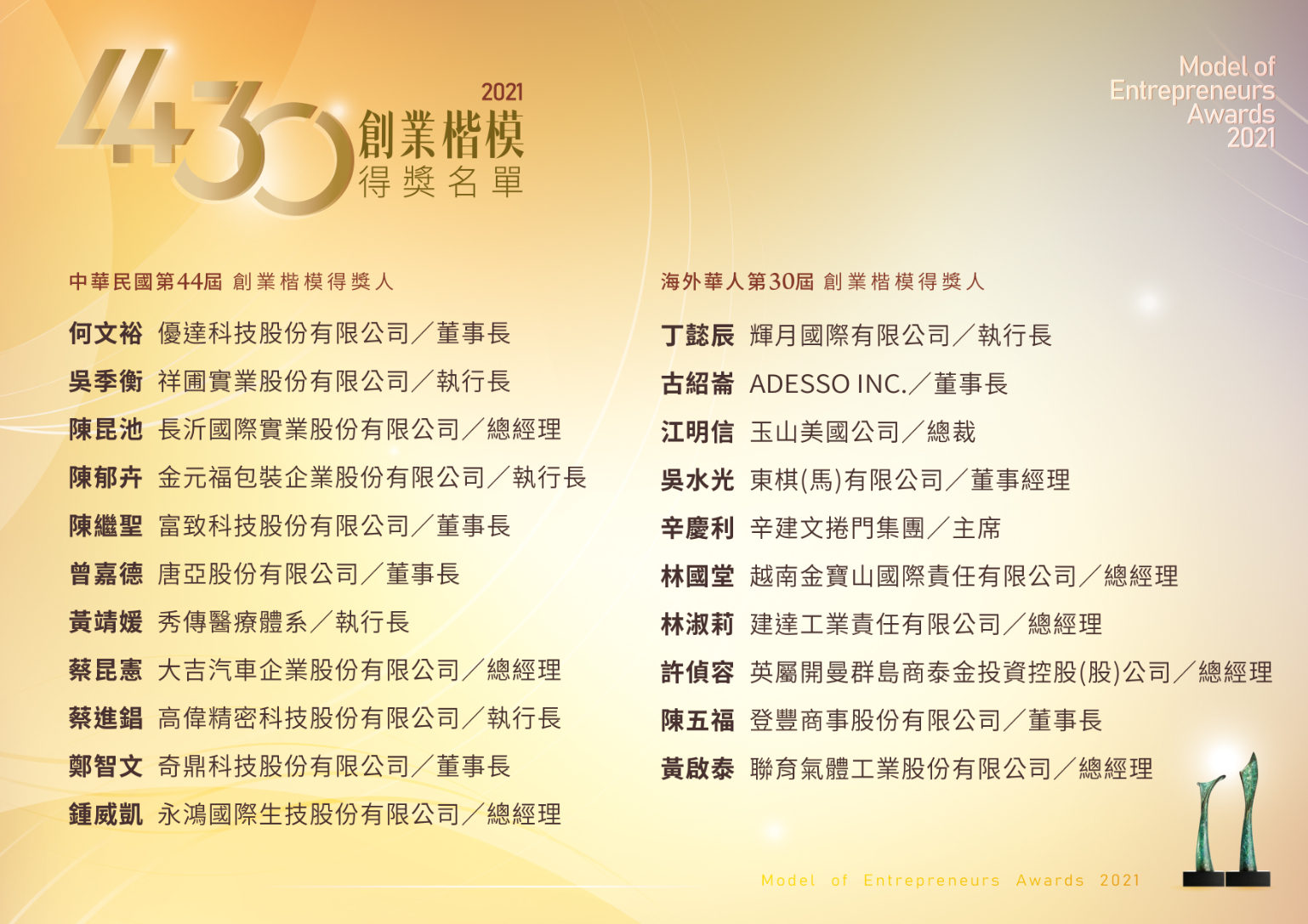 今年21位創業楷模得獎人除了全球電信白盒先驅優達科技、臺灣創新農食企業祥圃實業、國內連鎖茶飲品牌COMEBUY、亞洲第一大塑膠真空成型容器廠金元福、全國最具盛名的私人醫療體系秀傳、全球第一大刀具製造廠高偉精密、臺灣第一大動物藥廠永鴻國際生技之外,包括富致科技、唐亞公司、大吉汽車、奇鼎科技,以及來自美國的連鎖日本拉麵品牌輝月國際、全美第三大電腦周邊設備商ADESSO、知名家具銷售商玉山美國公司,以及來自越南的建達工業、金寶山;泰國的泰金控股、聯育氣體工業;馬來西亞的東棋、辛建文捲門集團以及日本的登豐商事,都是全球各大產業的指標型企業,充分展現今年得獎楷模堅實的創新與經營能力。