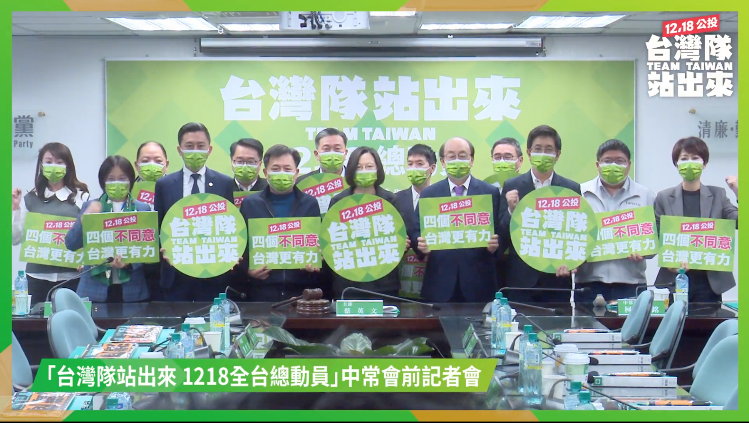 民進黨還搬出2020年總統立委大選時的「台灣派隊」,重新組織「台灣隊」。蔡英文提到,只要是關心台灣進步、未來的人就是「台灣隊」,就是台灣隊友。她呼籲民眾站出來投票,一人拉10票,四個不同意,向親友拉這四票,「公投不是要選誰,是要選擇你的未來,確保台灣更好的未來。」