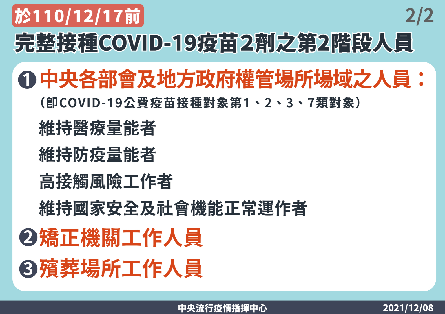 中央流行疫情指揮中心今(8)日表示,由於國際疫情持續嚴峻及Omicron新型變異株之威脅增加,考量國內COVID-19疫苗接種量能尚屬充足,為積極防範社區傳播風險,自111年1月1日起,中央各部會及地方政府權管場所場域之工作人員及從業人員,屬於維持醫療及防疫量能者、高接觸風險工作者、維持國家安全及社會機能正常運作者(即COVID-19公費疫苗接種對象第1、2、3、7類對象),以及矯正機關、殯葬場所工作人員等(詳如附件),因工作或服務性質具有「接觸不特定人士或無法保持社交距離」之特性,將強化上述人員COVID-19疫苗接種規範,共同維護國人健康安全。規範原則如下: