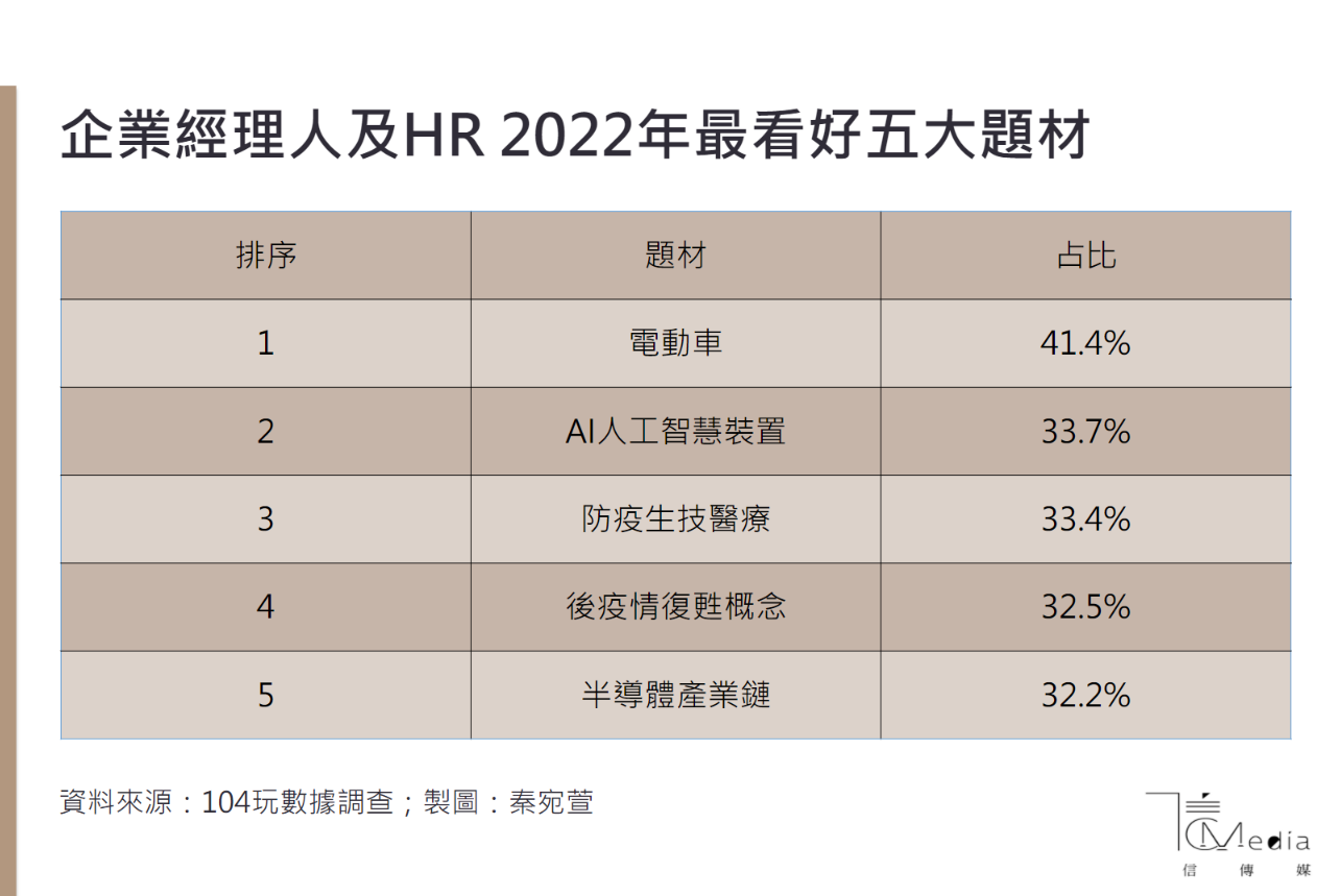 2022年最看好哪些題材?鴻海於今年科技日一次亮相三款自主研發電動車,歐盟也提案2035年禁售燃油車,在產官界齊力帶動下,41.4%的企業經理人和HR最看好電動車,其次是AI人工智慧裝置(33.7%)、以及防疫生技醫療 (33.4%)。其中,受訪主管看好第三名是元宇宙相關,舊科技的虛實整合新運用已給經理人極大的想像空間。