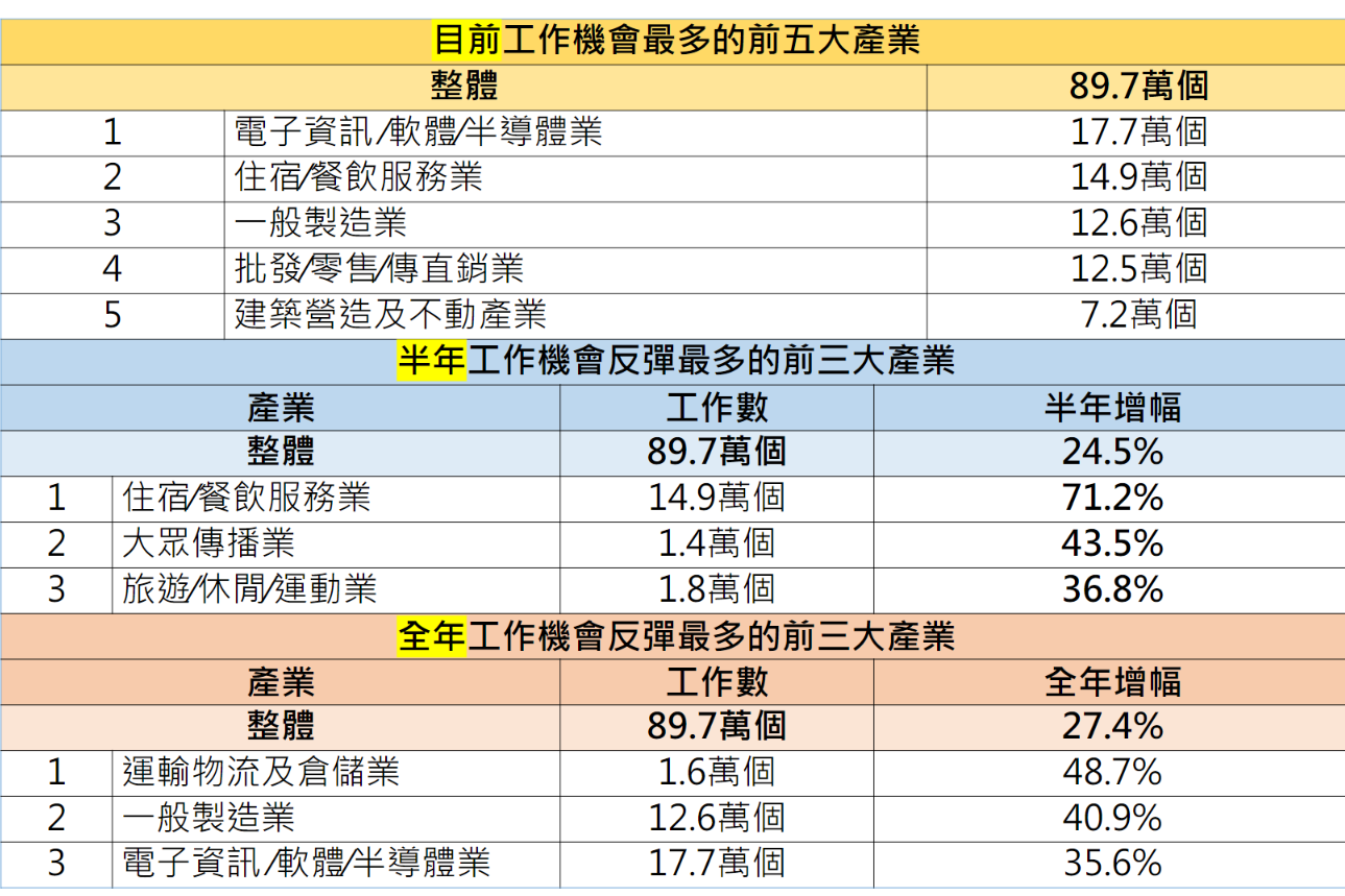 104人力銀行12月全站工作機會數89.7萬個,比7月谷底的72萬個,增加17.6萬個,增幅24.5%。各產業之中,以一般製造業、電子資訊 ∕軟體∕半導體業徵才最強勢穩健,能見度也最高。三種排行如下: