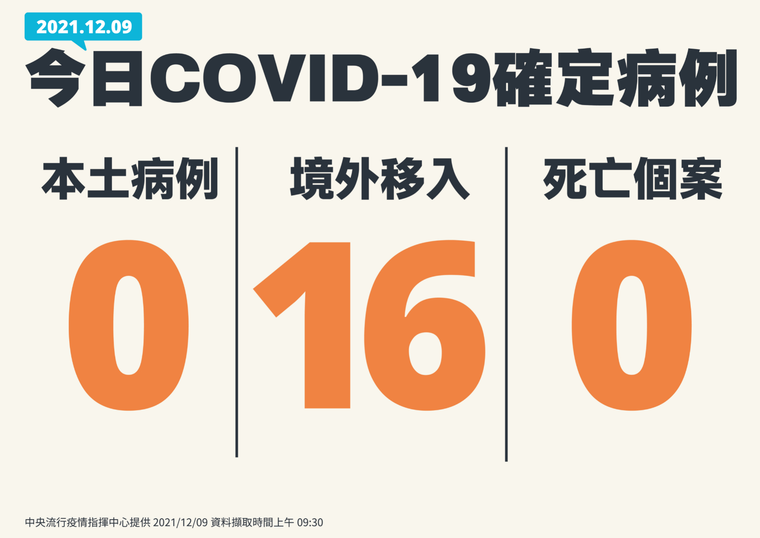 中央流行疫情指揮中心今(9)日公布國內新增16例COVID-19境外移入確定病例,其中8人為突破性感染,另確診個案中無新增死亡。