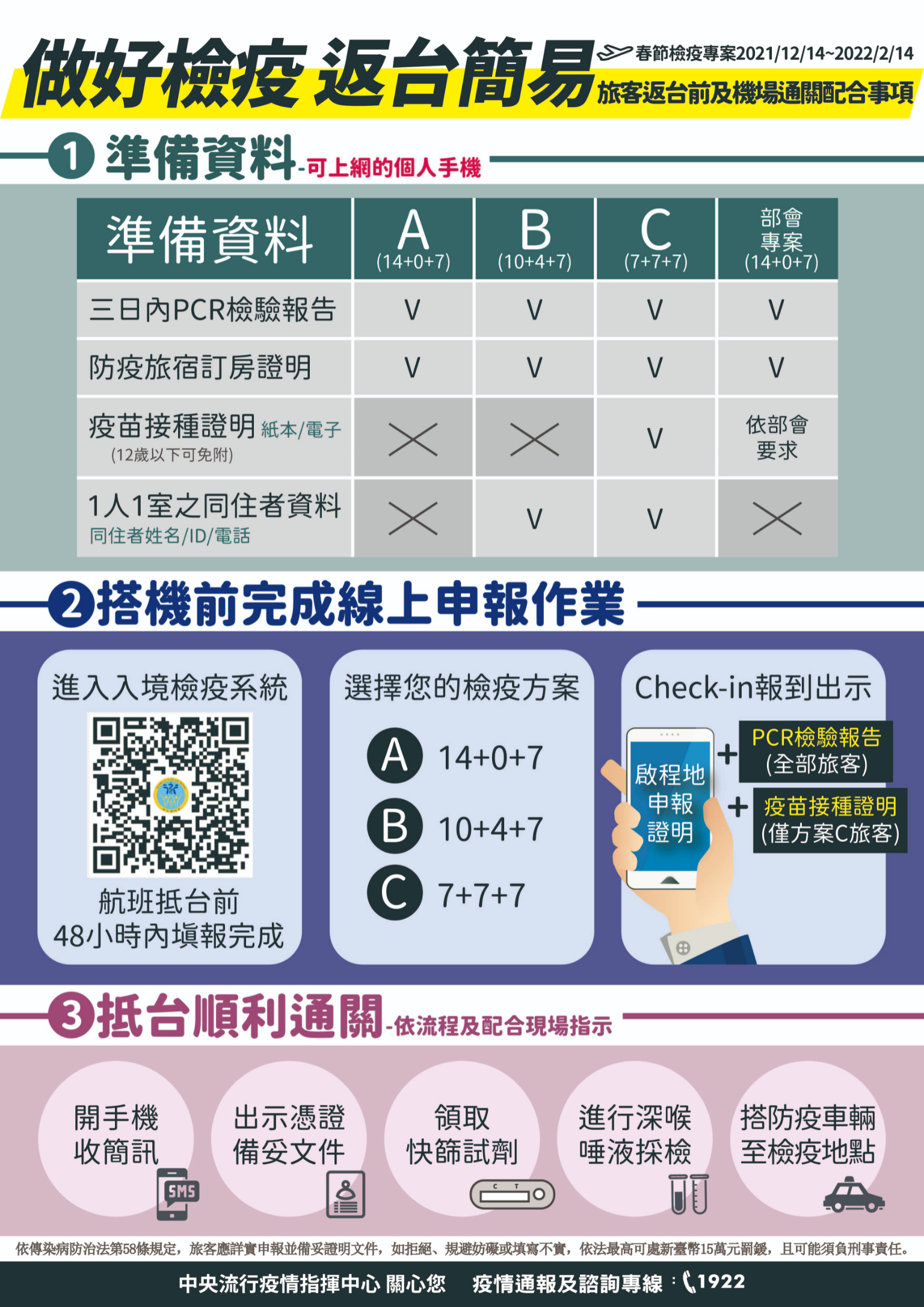 指揮中心指出,春節檢疫措施專案將於下週二(12月14日)上路,預期將湧現返鄉人潮,提醒12月14日至明(2022)年2月14日期間自國外返臺旅客,必須瞭解及配合以下三步驟,事先做好檢疫,返臺將更簡易: