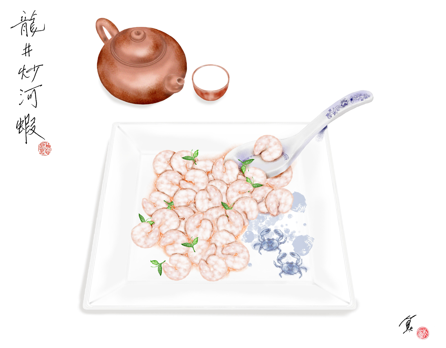 雨過天晴後,又繞了繞附近名勝,來到一家小酒肆,口乾舌燥,便從藏在便服裡的龍袍取出茶葉要店家沖泡,眼尖的店小二瞧見龍袍,知是皇帝大駕光臨,急忙報予裡頭掌廚的老闆知曉,老闆大驚,正忙著炒蝦仁中,錯把皇帝的龍井茶當蔥段撒進蝦仁裡,誰知皇帝一吃,清香爽口,大呼好菜!從此一舉成名。