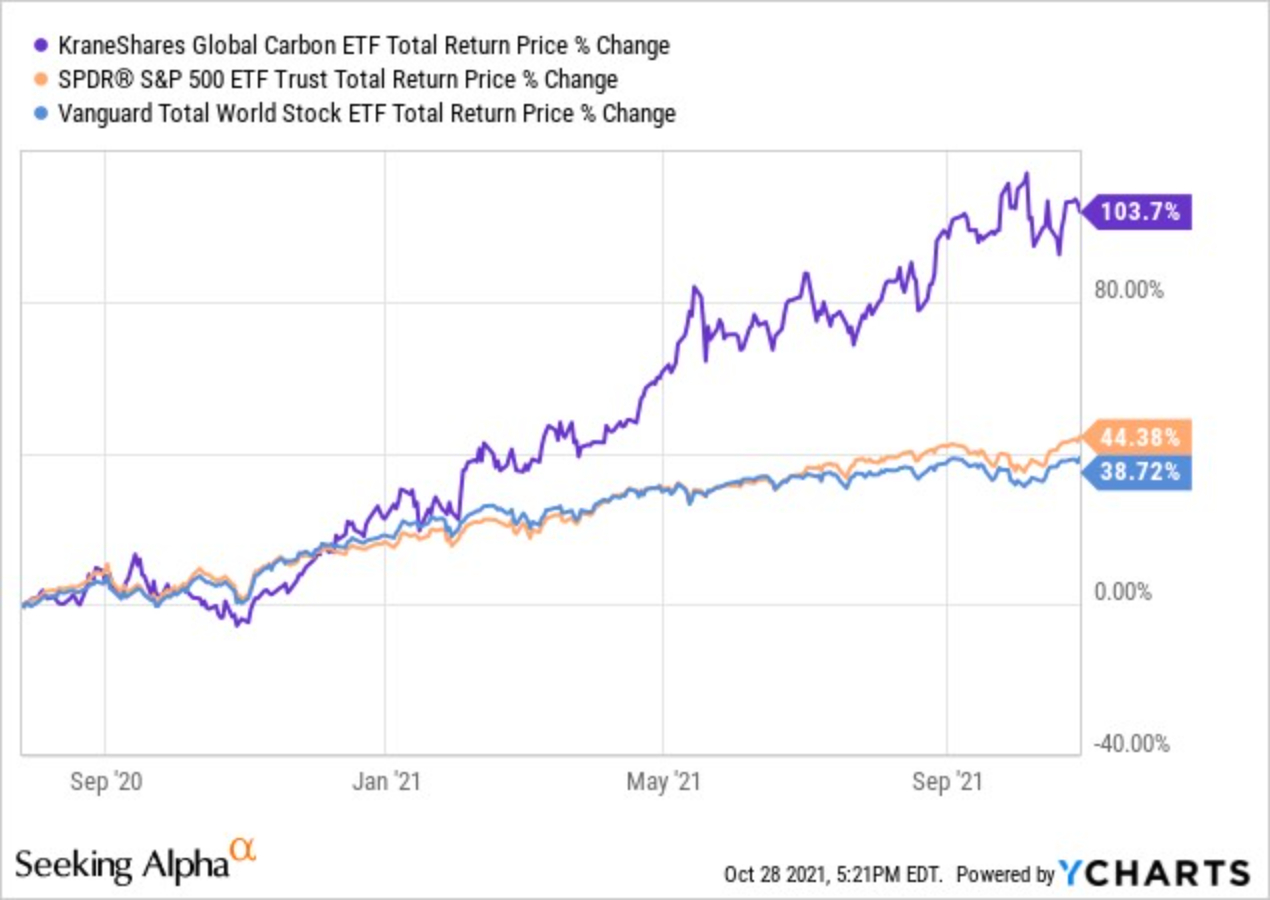 根據ETF.com的資訊,全球目前與碳權相關的ETF只有四檔,其中只有一檔KRBN資產規模一枝獨秀,截至2021/11/29,其資產規模已經達到14.1億美元。另外一檔GRN勉強達到1億美元規模門檻,其他兩檔ETF則都還不成氣候。其實KRBN這檔ETF去年(2020)七月成立時規模不過300萬美元,早期投資人大都是美國機構投資者與退休基金,但隨著投機與投資的資金不斷湧入歐盟與美國加州的碳交易市場,推高了碳權的交易價格,KRBN這檔ETF也在短短不到一年半的時間,不僅單位淨值上升超過100%,基金規模成長超過40倍。