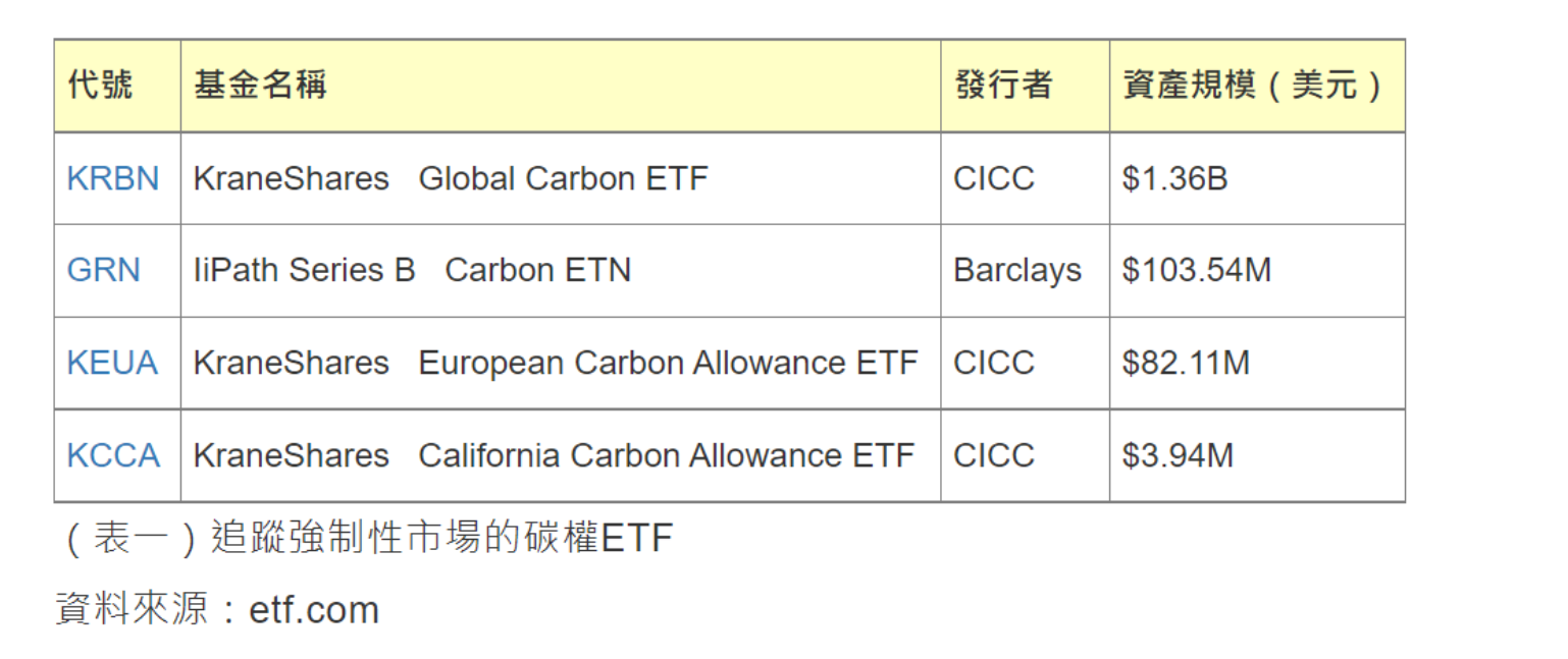 這就是大多數人對自願性市場的誤解。其實自願性市場市值、流動性皆不如強制性市場,包裝成金融商品自然較難以被市場接受,反觀強制性市場是被管制者一定要達到被賦予的排放目標,無法減量的業者只能去購買其他業者剩餘的碳權,以抵減自己的排放量。有足夠的參與者,有足夠的流動性,包裝成ETF才有人買。