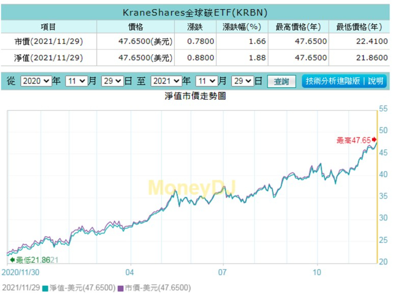 當大家對這三個市場的碳權預期價格越高,KRBN這支ETF就會上漲。我們來看看KRBN這檔龍頭碳權ETF過去的價格歷史走勢: