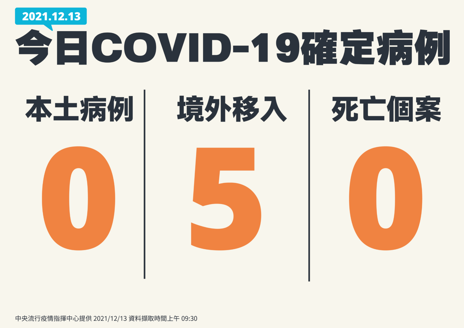 中央流行疫情指揮中心今(13)日公布國內新增5例COVID-19境外移入確定病例;另確診個案中無新增死亡。