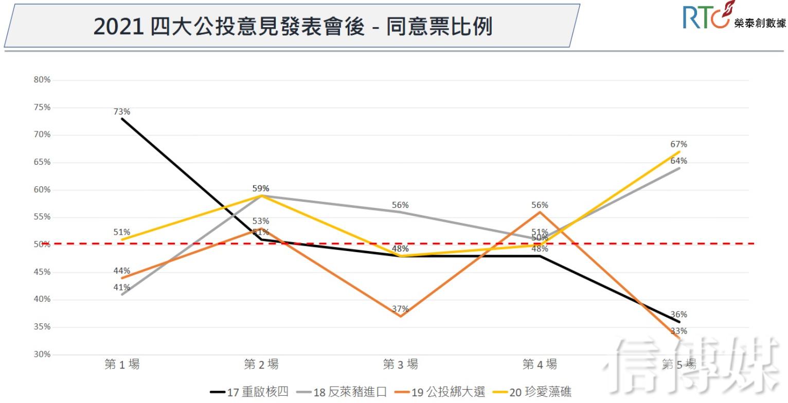 根據《榮泰創數據》最新輿情分析,4項公投舉行5場意見發表會之後,截至12月11日為止,「反萊豬」的同意票比例攀升到64%,「三接遷離」來到67%,但「重啟核四」則僅有36%,至於「公投綁大選」更僅剩33%的同意票比例;整體呈現出2好2壞的民意趨向。