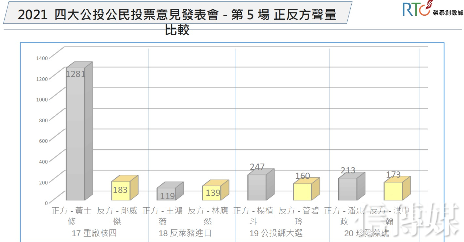 只不過,該場重啟核四的同意比例竟只剩下36%,不同意比例則高達64%。而在黃士修個人爭議極大的情況下,《榮泰創數據》指出,第一場意見發表會時,重啟核四的同意票比例本來是全部公投案中最高的,高達73%;但5場發表會下來,重啟核四的同意票比例最終只剩36%,暴跌近4成。
