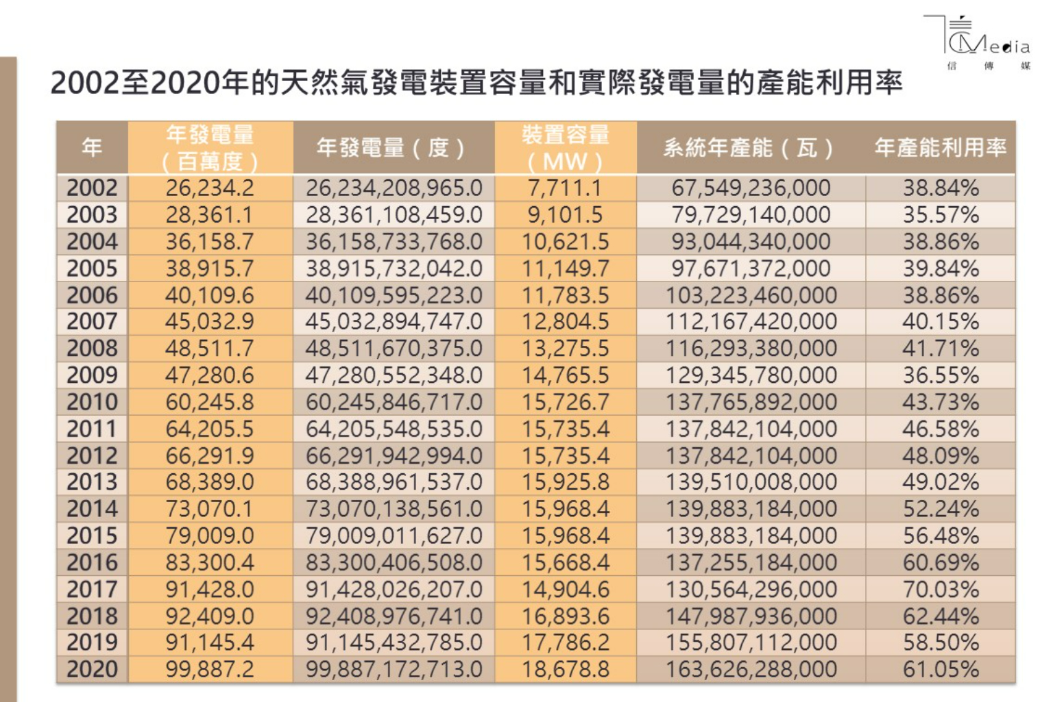 我們以過去19年的天然氣裝置容量、發電量來計算其系統「產能利用率(容量因素)」,因為用百萬度、MW一般人不容易看懂,所以改為度、瓦為單位。(橘色為能源局公布資料)