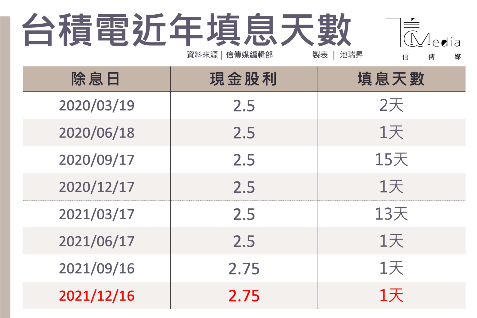 台積電第2季現金股利今天除息,每股配發2.75元現金,總金額713.08億元,預計明年1月13日發放。台積電自2019年起改採每季配息,過去9次除息皆順利完成填息,其中有5度在除息當天快速填息,填息時間最長為15個交易日。