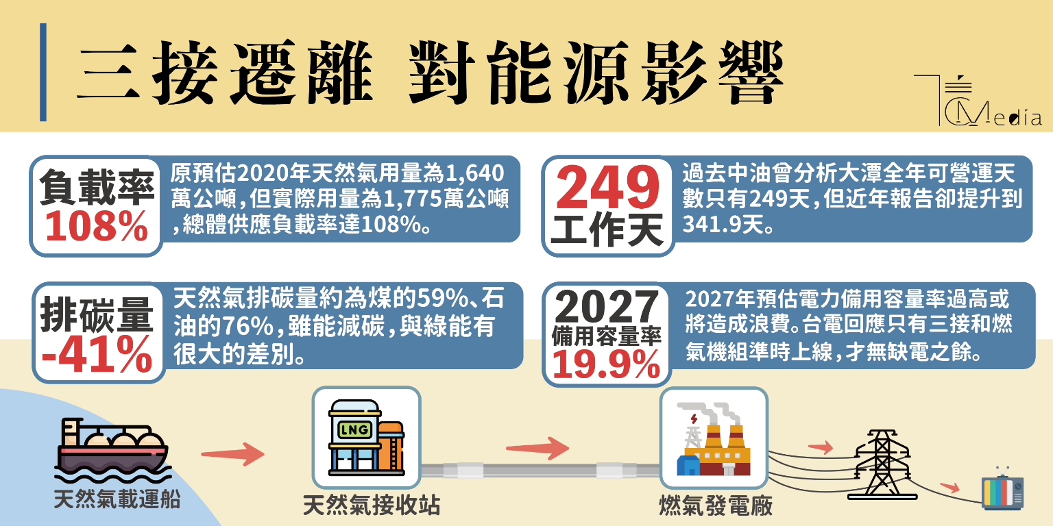 反方代表王美花則指出,由於台商回流、全球晶片需求提高等原因,未來幾年台灣的用電需求將大增,再加上能源轉型政策,燃氣機組將成為台灣十分仰賴的電力來源。反方代表趙家緯則引用自身研究,認為台灣未來對天然氣的需求保守估計將成長四成。若三接沒有順利建成,2025年時台灣會出現無法以調度解決的天然氣缺口,估計將影響約100~137億度的發電量。