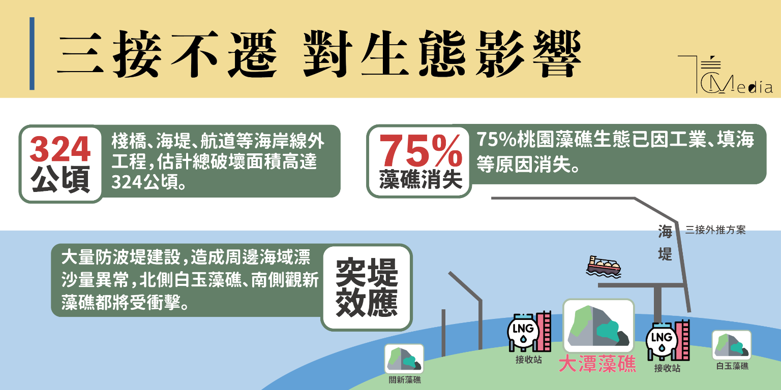 根據環團估計,目前「三接外推」方案對周邊生態的破壞面積將達到324公頃,遠超過經濟部估計的23公頃。且大量海提建設所帶來的「突提效應」,將使影響擴及南邊的關新藻礁及北邊的白玉藻礁,更可能對大潭電廠的出水口造成堵塞。正方代表林惠真就批評,所謂的外推方案只是政府面對公投的止痛藥,且反而造成更大面積的破壞。