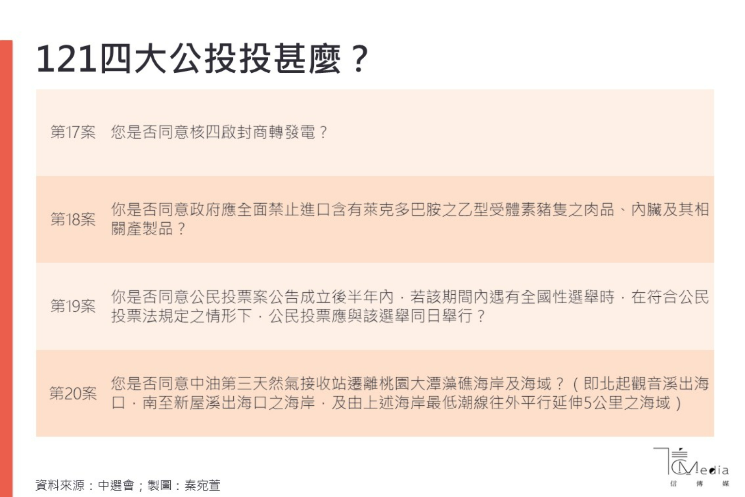 這次公投共計有4案,分別為第17案「核四重啟」、第18案「反萊豬進口」、第19案「公投綁大選」、第20案「三接遷離大潭藻礁」。
