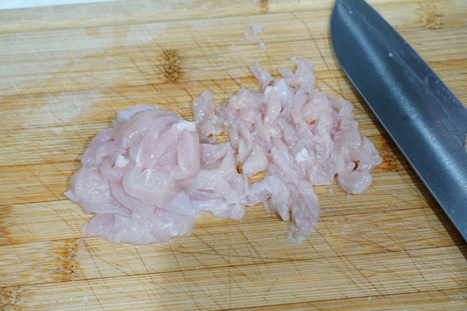 將雞胸肉剁成絞肉。當然也可以直接買現成的雞胸肉。