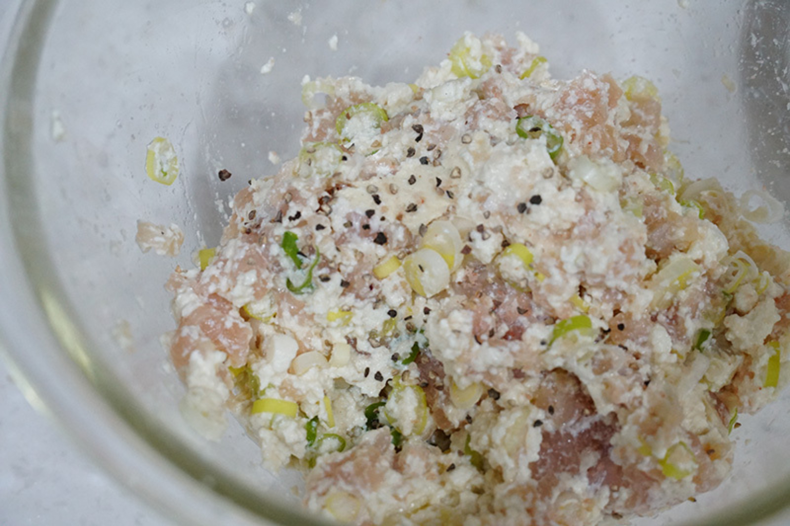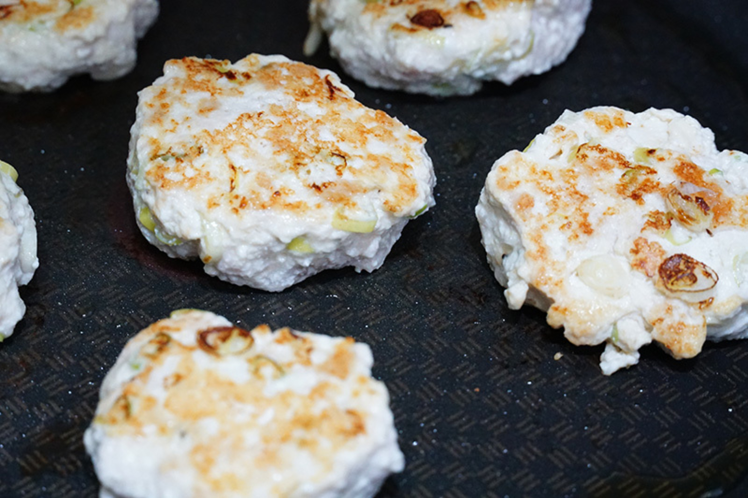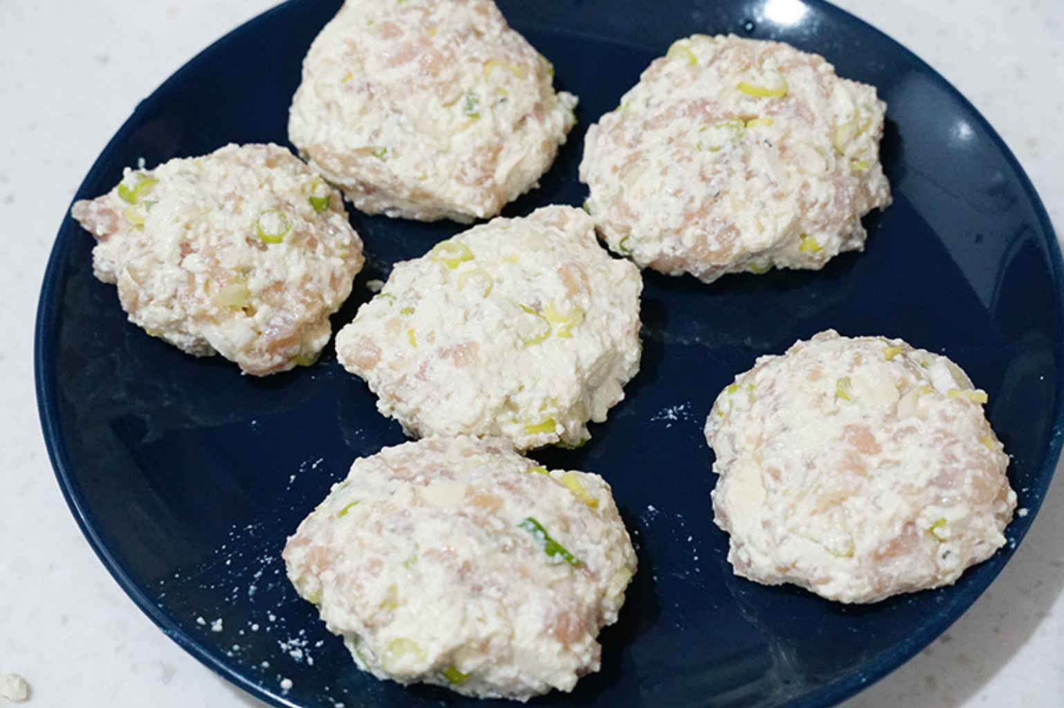 因為豆腐雞肉餅質地很軟,所以不建議分成太大份,等等下鍋會比較好煎。