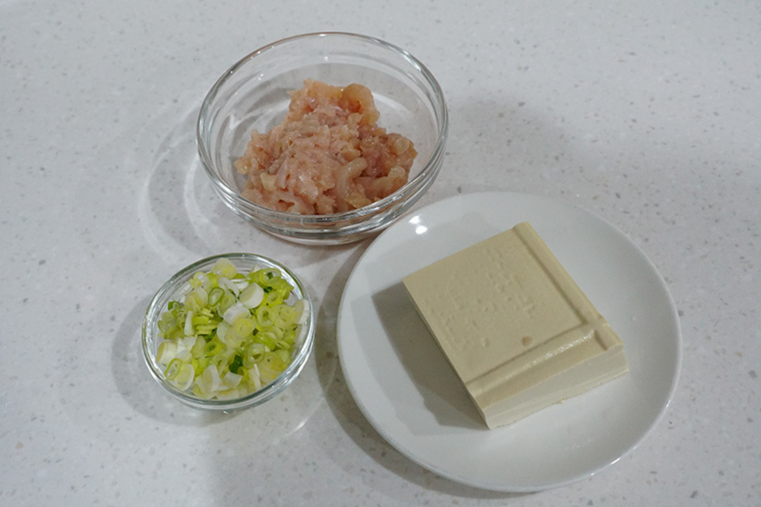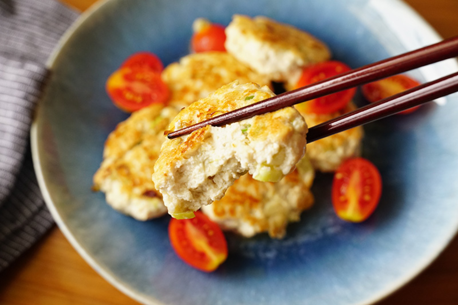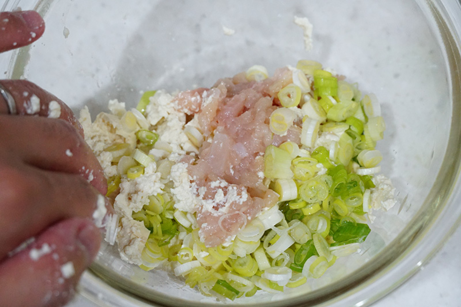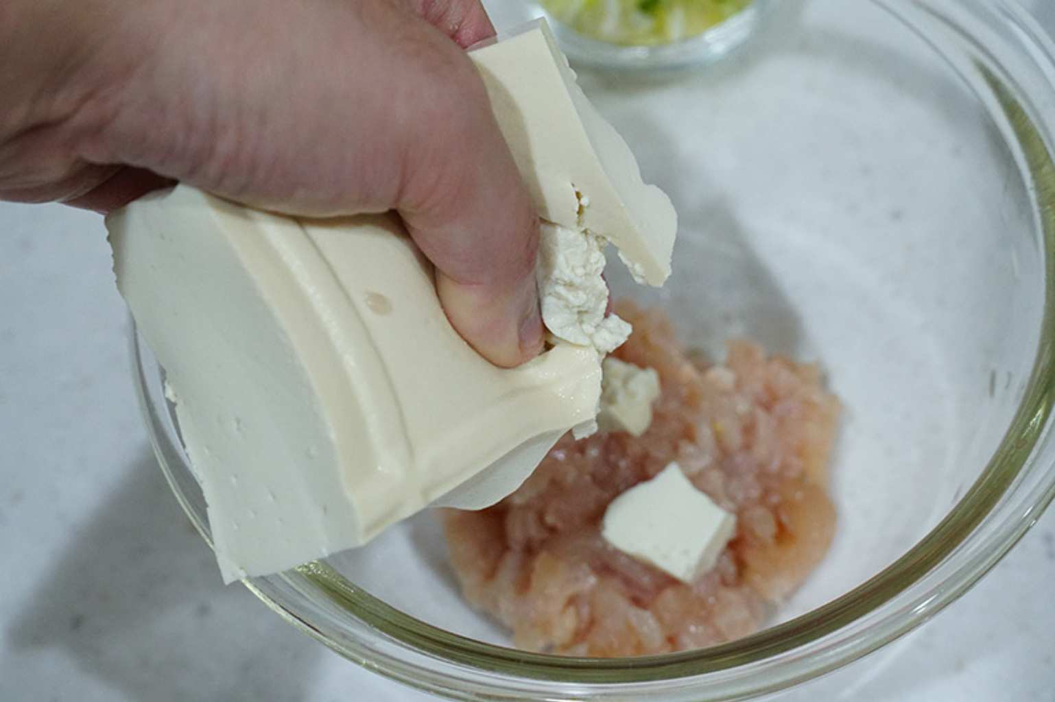 因為豆腐雞肉餅質地很軟,所以不建議分成太大份,等等下鍋會比較好煎。