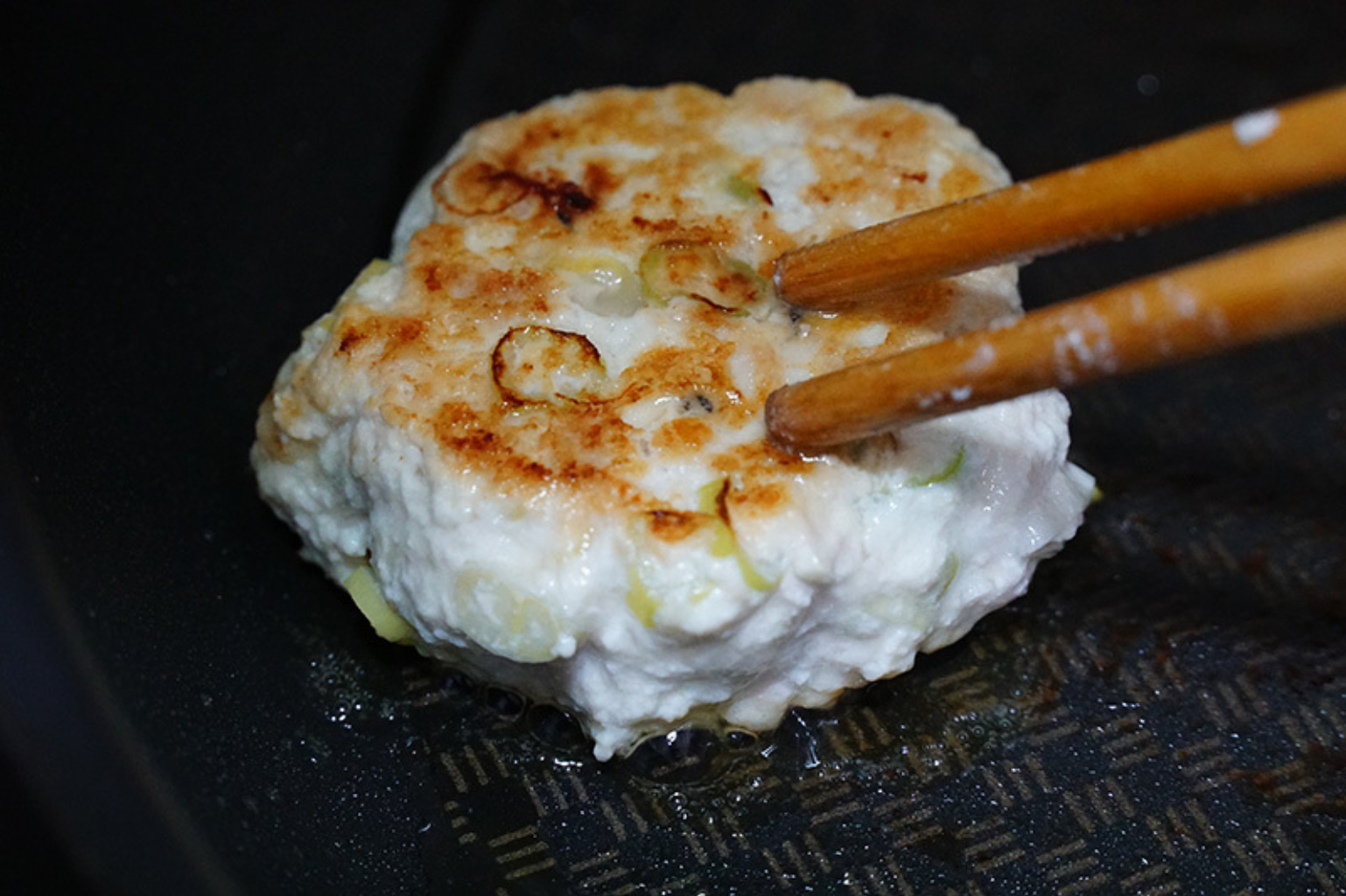熱一平底不沾鍋油鍋。將豆腐雞肉餅,下鍋兩面煎熟。過程建議使用中小火。