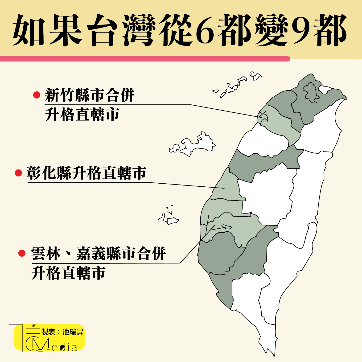 蔡英文總統昨(19)日召集民進黨要角會商,就《地方制度法》修法達成共識。民進黨立法院黨團總召柯建銘表示,若修法通過,包括新竹縣市、雲嘉嘉、彰化縣市都具有合併升格直轄市的條件,台灣將從原本6都變成9都。