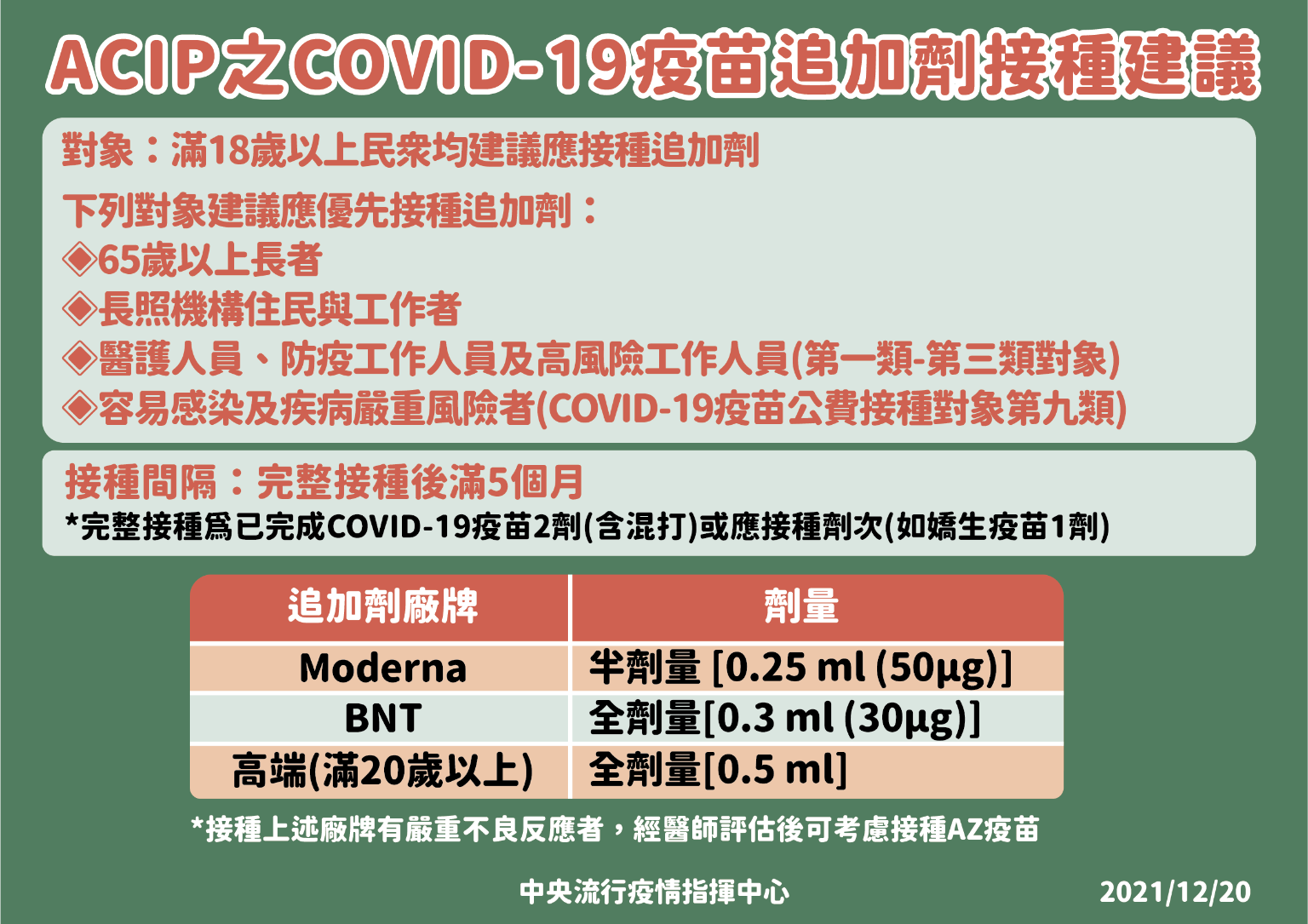 台灣出現Omicron變異株病例,新冠疫苗第3劑也於12月10日起全面開放,ACIP(衛福部傳染病防治諮詢會預防接種組)委員會19日開會討論,高風險族群幾乎已打滿5個月,第3劑無需調整施打間隔,廠牌都可以自由選擇,但莫德納打半劑量,BNT、高端全劑量。