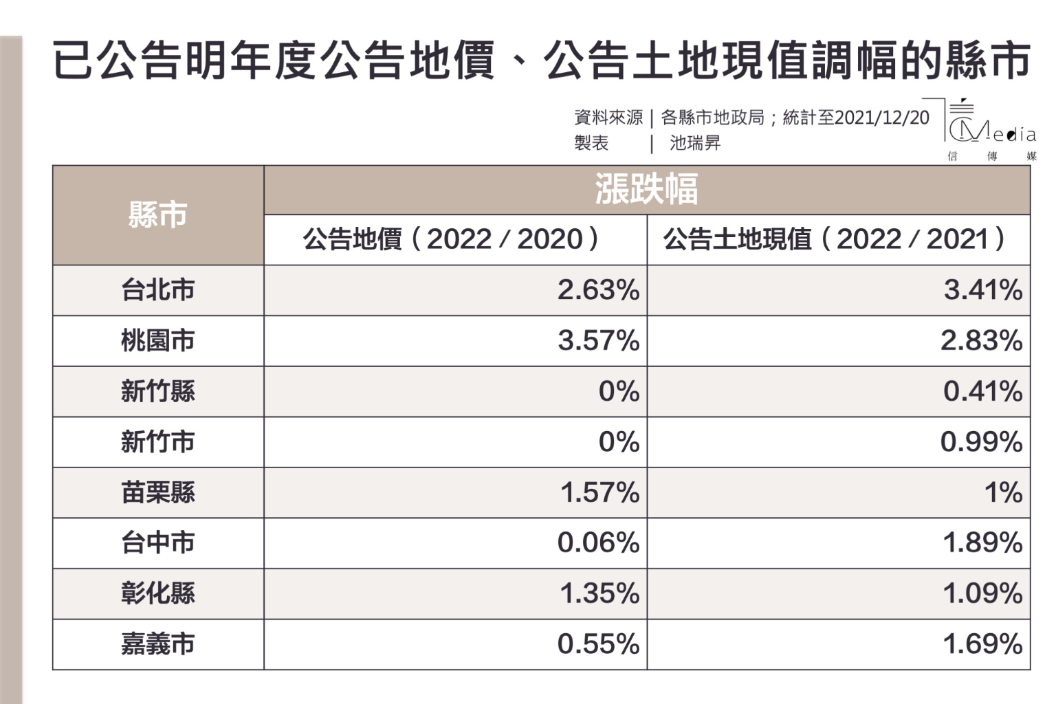 截至12月20日為止,北台灣還有基隆市、新北市尚未公告,但從目前全台已公告的縣市當中可看出,公告土地現值調漲以台北市上漲3.41%最多,桃園市上漲2.83%位居第二,台中市則是上調1.89%;至於攸關土地價格的公告地價,目前則以桃園市上漲3.57%暫居第一,其次則是桃園市2.63%,但新竹縣市仍維持凍漲,讓許多人有些訝異。
