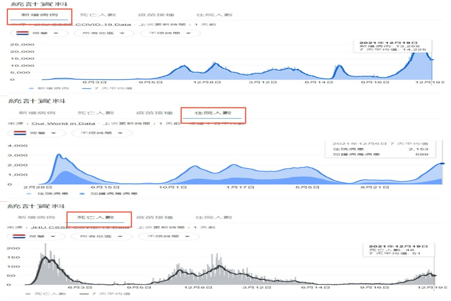 從統計上來看,荷蘭每日新增病例雖然在下降中,但這波疫情也是COVID-19爆發以來新增確診最多的一波,另外,住院人數與死亡人數也有明顯上升的趨勢。