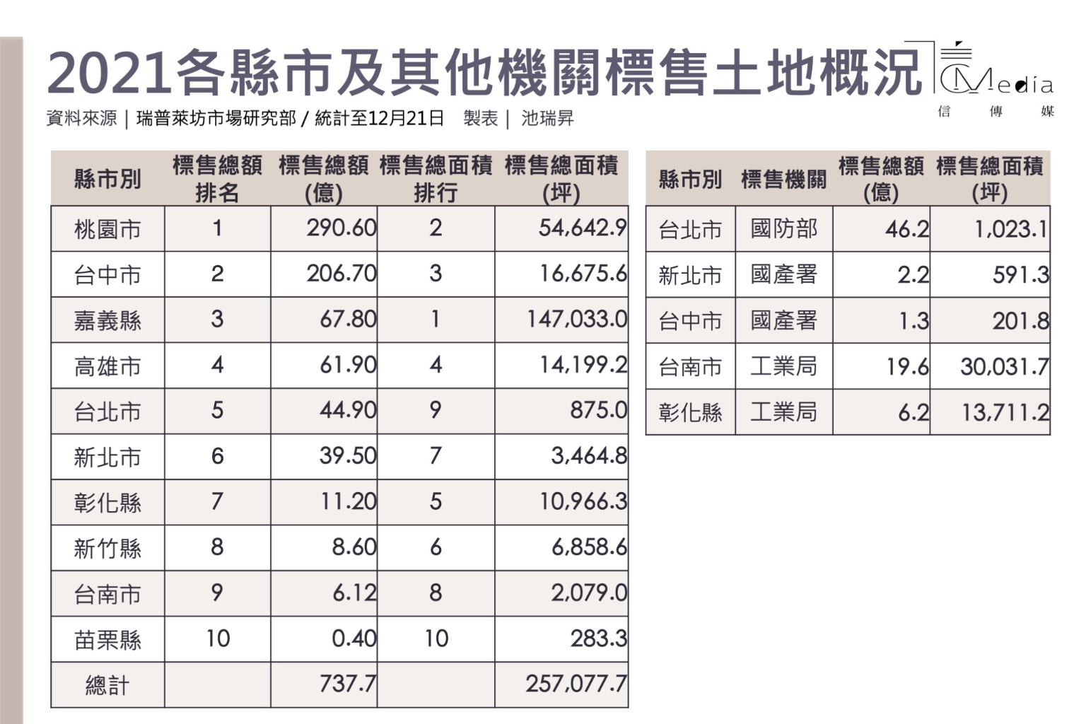 根據瑞普萊坊統計,截至今年12月21日為止,桃園市已榮登了今年各縣市的「賣地王」,合計標售出脫的金額高達290億元。