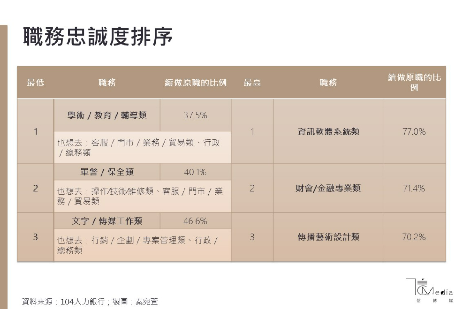 104玩數據發現,學術/教育/輔導、軍警保全、文字/傳媒這三大職務無法同時滿足產業能見度高、以及核心職務兩大條件,職務忠誠度僅3到4成,換言之,平均每一百位擔任這些職務的求職者有三、四十位想轉其他職務。最想走跳到客服/門市/業務/貿易類(廣納百川)、行政/總務類(入門門檻低)、行銷/企劃/專案管理類(以文字/大眾廣宣為基底)、及操作/技術/維修類為多。