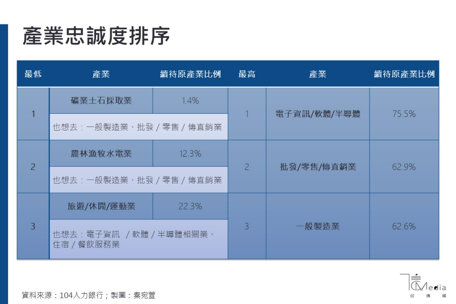 相反的,在相同產業內打轉、產業忠誠度最高的是電子資訊/軟體/半導體75.5%,其次是批發/零售/傳直銷業62.9%、一般製造業62.6%。求職者死心塌地主要反映該產業前景佳,產業的涵蓋面廣、吸納並支撐主要的徵才市場。