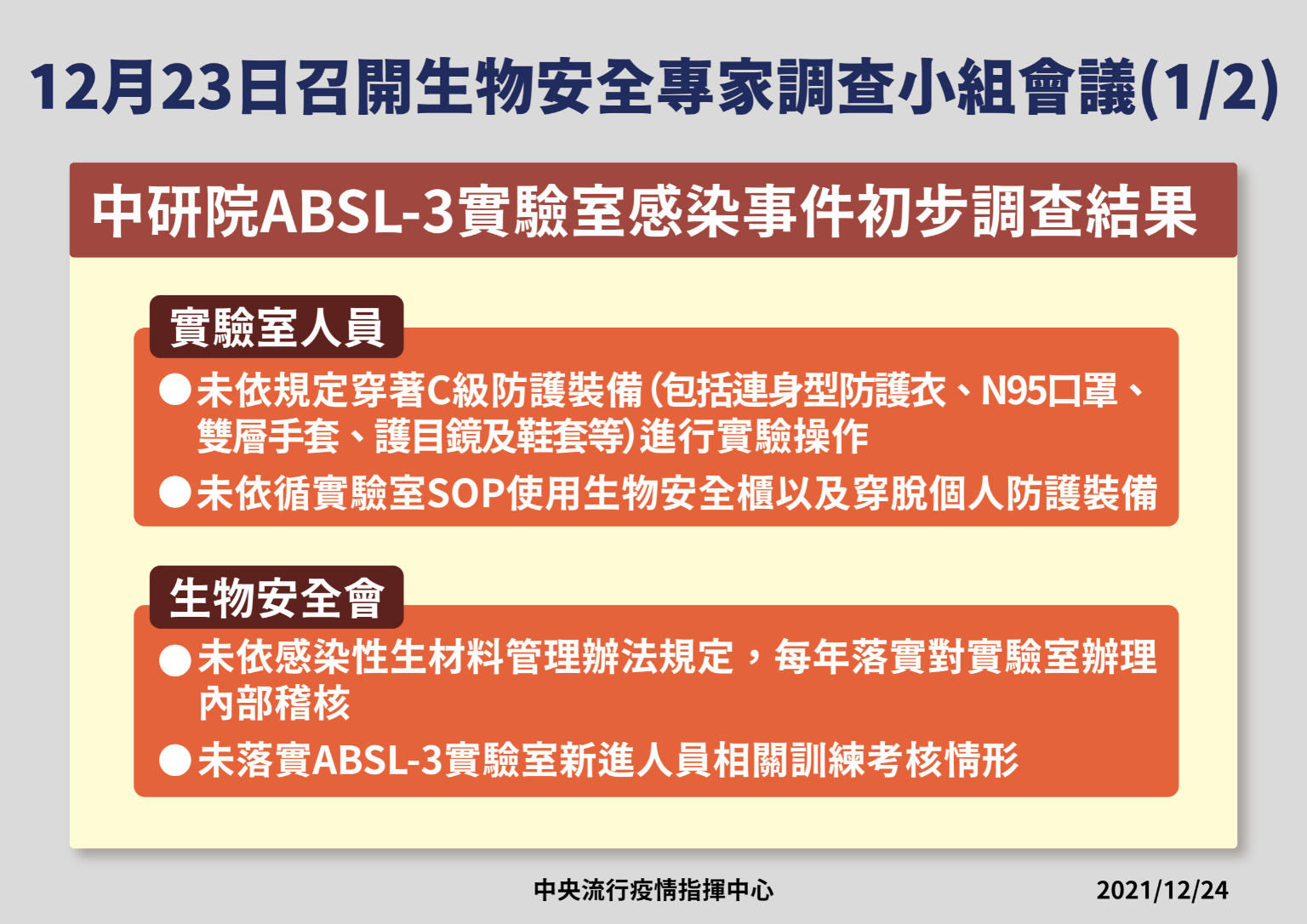 指揮中心今(24)日表示,昨(23)日召開生物安全專家調查小組會議,針對中研院提供動物生物安全第三等級(Animal Biosafety Level 3, ABSL-3)實驗室內部調查報告,以及調查小組先前進行中研院相關人員訪談紀錄與實驗室內部監控影帶及資料,討論造成實驗室感染之可能原因。經初步調查結果如下: