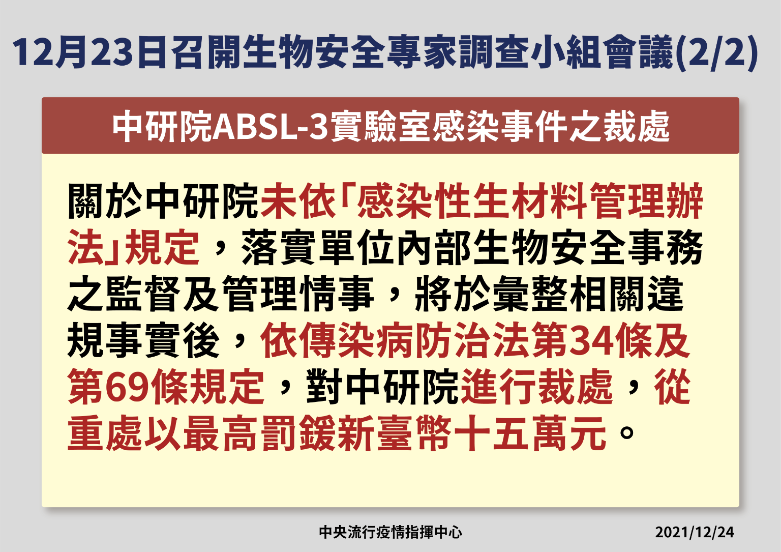 指揮中心說明,調查小組將於釐清相關事實後,完成最終調查報告,屆時再由指揮官統一對外說明。另對於中研院未依「感染性生材料管理辦法」規定,落實單位內部生物安全事務之監督及管理情事,將於彙整相關違規事實後,依傳染病防治法第34條及第69條規定,對中研院進行裁處,從重處以最高罰鍰新臺幣15萬元。