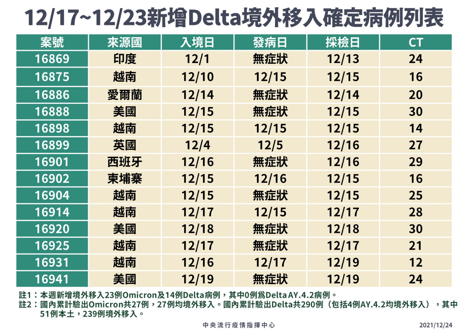 指揮中心說明,今日新增20例境外移入個案,為14例男性、6例女性,年齡介於10多歲至60多歲,分別自美國(7例)、越南(3例)、菲律賓(2例)、泰國(案16966)、德國(案16969)、馬來西亞(案16972)、印尼(案16975)、印度(案16976)、加拿大(案16978)、立陶宛(案16984)及日本(案16981),入境日介於今(2021)年11月21日至12月22日。