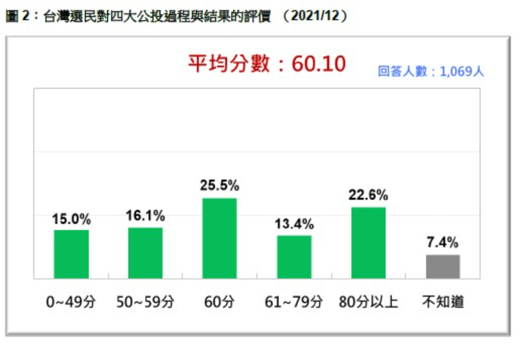 根據台灣民意基金會民調,民眾替本次公投的過程和結果只打上60.1分,徘徊在及格邊緣,其中民進黨支持者均分76.85分,國民黨支持者均分48.88分,六都和各縣市的分數也在及格分上下。台灣民意基金會董事長游盈隆指出,這項結果代表民眾對公投的評價並不高,僅是勉強接受而已。