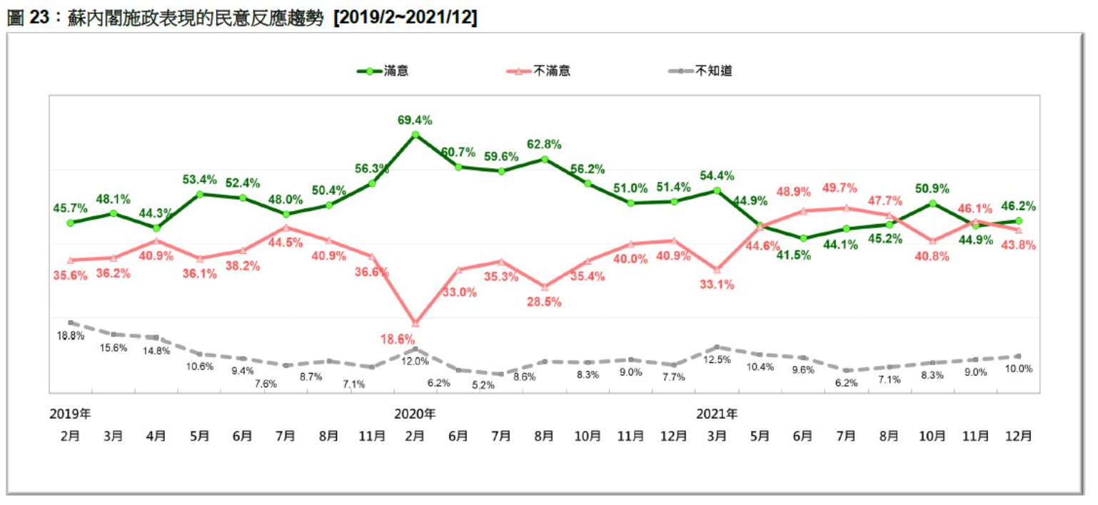 進一步分析2021年蔡英文聲望的起伏跌宕,1至4月皆跨過五成,5月因本土疫情爆發而大幅下挫9個百分點,6月更首度出現死亡交叉,滿意度跌至43.2%,也是2020年總統大選後的新低點。7月以後疫情趨緩,民調逐步回升,但除10月解封讓滿意度飆高至54.4%外,仍未重新回歸五成關卡。