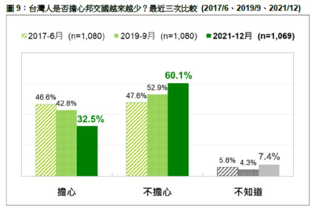不過據民調顯示,相較於2019年9月與索羅門群島斷交,台灣民眾對斷交一事似乎愈來愈無感。擔心邦交國減少者下降10.3個百分點,僅剩下三成二,不擔心者則上升7.2個百分點,高達六成。即便時間拉長到2017年6月巴拿馬與我國斷交期間,擔心比率亦在下降。顯示台灣人愈來愈習慣斷交事件的發生,甚至感到無動於衷。