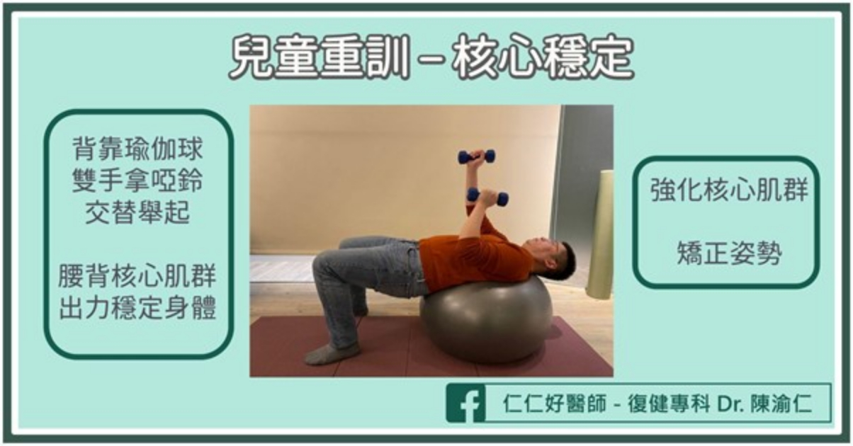 2. 核心穩定:孩子背靠瑜伽球,雙手拿啞鈴交替舉起,腰背核心肌群出力穩定身體。強化核心肌群也可輔助矯正孩子的姿勢。