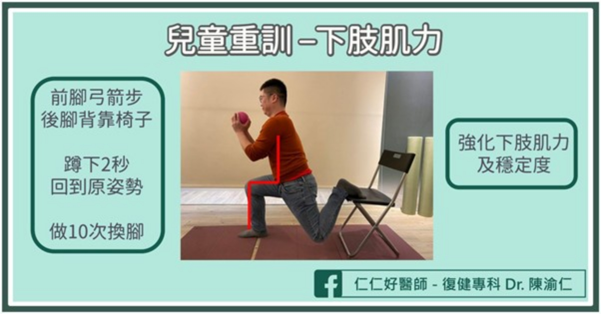 3. 下肢肌力:前腳弓箭步、後腳背靠在椅子上,蹲下2秒再回到原姿勢,做10次再換腳。強化下肢肌力及穩定度。