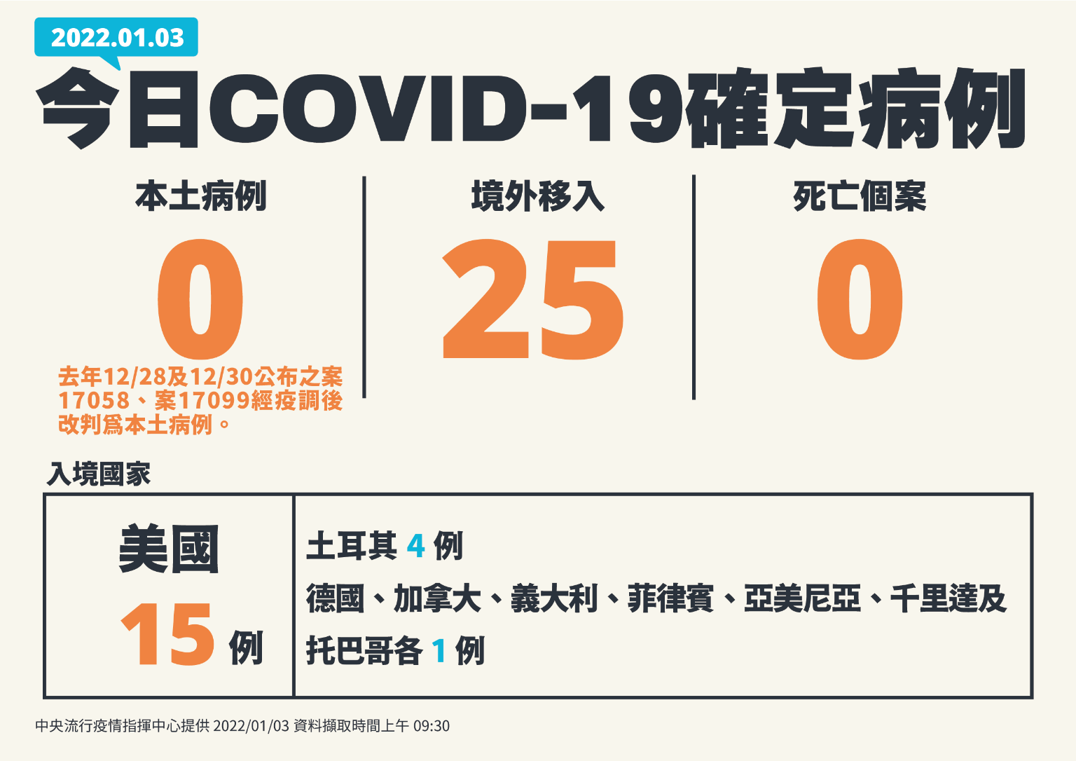 中央流行疫情指揮中心今(3)日公布國內新增25例COVID-19境外移入確定病例;另確診個案中無新增死亡。