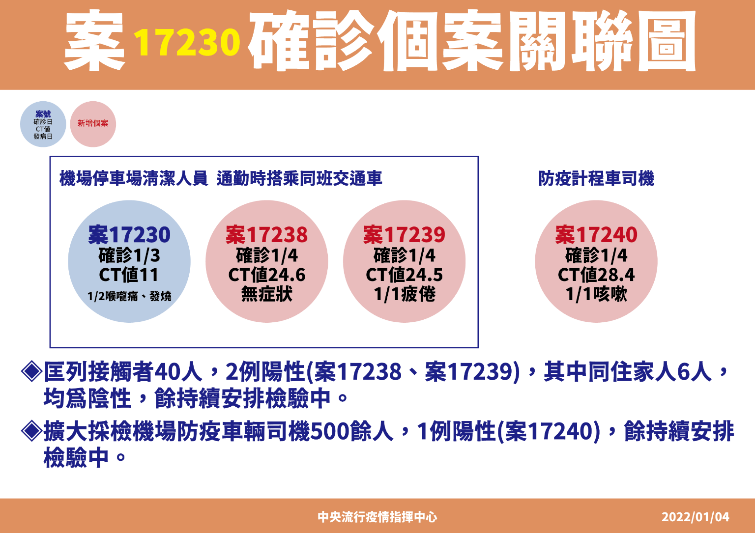 指揮中心表示,案17238-17240為本國籍,1例男性、2例女性,年齡均為50多歲,皆已接種2劑疫苗,為案17230接觸者。案17238及案17239均為同職場工作人員,通勤時搭乘同班交通車,案17239於1月1日起陸續出現疲倦、咳嗽、流鼻水症狀;案17240為防疫計程車司機,1月1日出現咳嗽症狀,3人經衛生單位安排採檢後於今日確診,相關疫情調查、接觸者匡列及防治工作刻正進行中。
