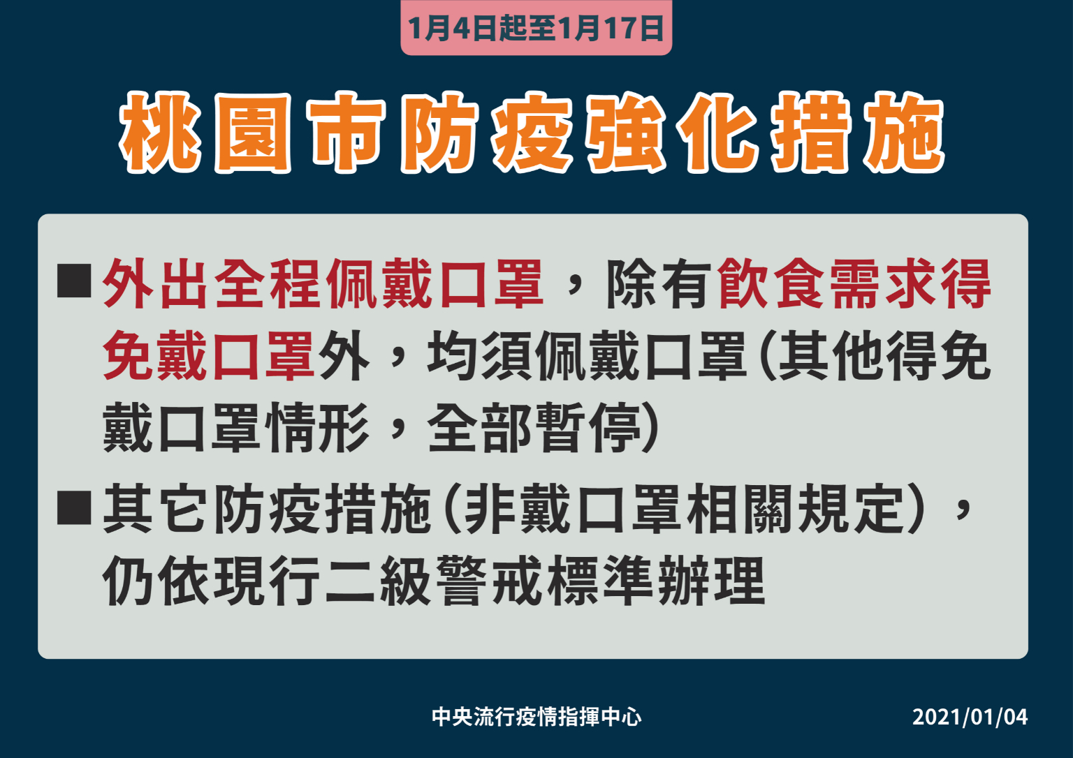 指揮中心表示,截至2022年1月3日為止,我國COVID-19疫苗第一劑接種率約80%,第二劑接種率約69%,為因應國際疫情持續嚴峻及Omicron新型變異株之威脅增加,接種涵蓋率仍須再提升,目前COVID-19疫苗由地方政府衛生局指定/安排之合約醫療院所或衛生所進行接種,鼓勵尚未接種過任何1劑COVID-19疫苗及符合接種間隔但尚未完成2劑COVID-19疫苗接種之民眾,請儘速前往COVID-19疫苗合約醫療院所接種。