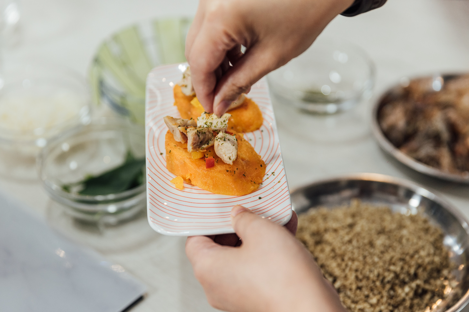 4. 將雞肉塊、甜椒丁鋪在地瓜厚片上,並撒上無調味海苔粉裝飾。