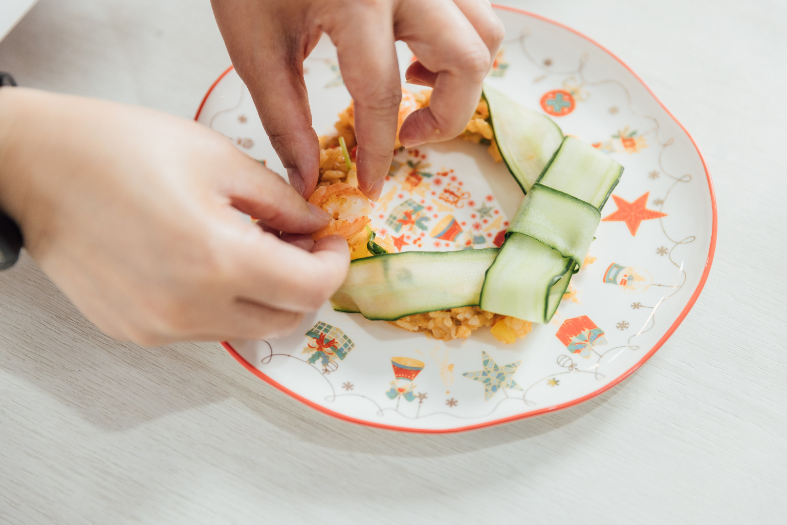 主餐「耶誕花圈鮮蝦燉飯」則以鮮蝦為基底,拌炒舞菇、甜椒、豌豆苗及白飯,含有豐富的蛋白質、多醣體、抗氧化蝦紅素、維生素,加上食材以切碎方式處理,適口、好吸收。最後擺盤成花圈樣式,再以黃瓜薄片、少量杏仁片及無調味海苔裝飾,富有濃濃的耶誕氣息。