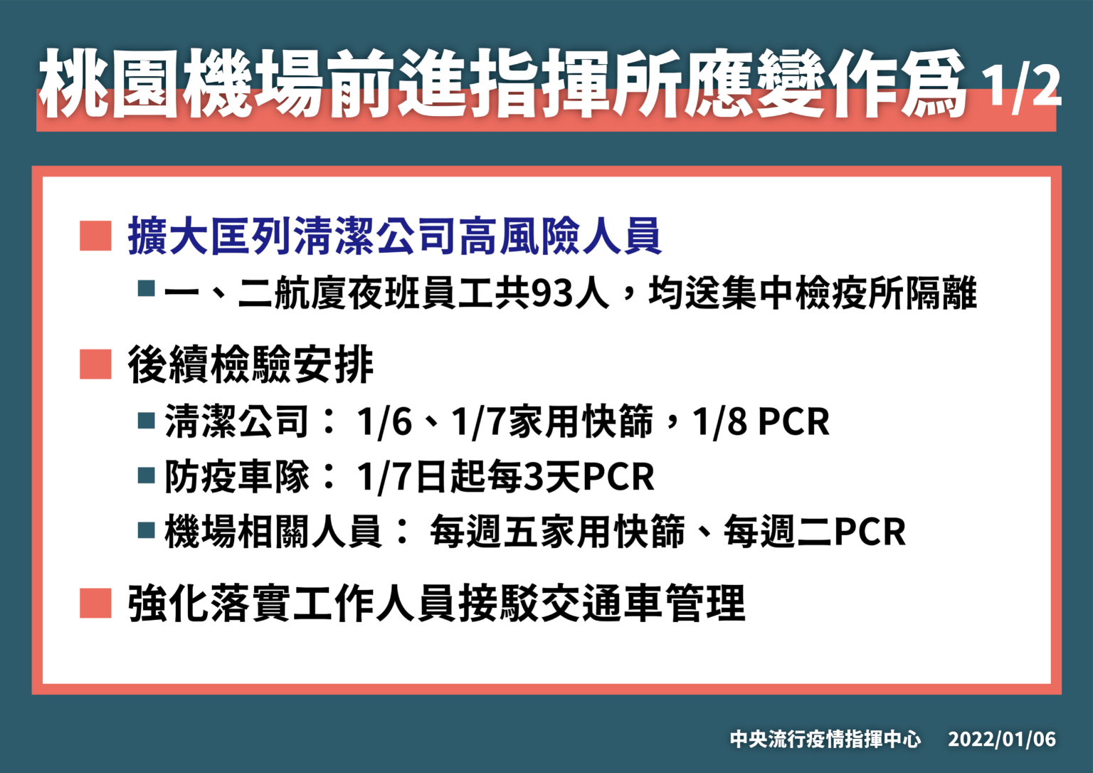 指揮中心呼籲醫療機構落實感染管制、強化門禁管制及工作人員健康監測、加強員工使用適當個人防護裝備,以預防並降低醫院群聚感染風險。由於Omicron新型變異株可能造成突破性感染,降低疫苗之保護力,指揮中心籲請可接種追加劑疫苗之醫院工作人員儘速接種追加劑疫苗,以確保人員健康安全。指揮中心將持續監測國內外疫情發展,確實掌握病床數及相關醫療資源分配,滾動修正相關應變策略,完善醫療照護體系,確保醫療量能充足以因應疫情。