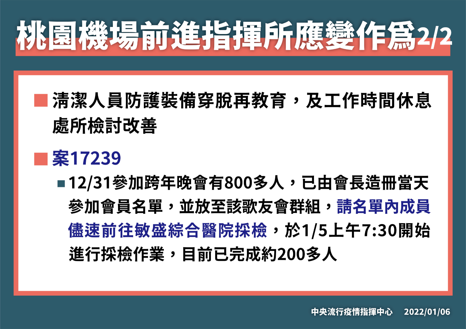指揮中心也在昨晚公布,因應桃園機場感染事件,指揮中心於第一時間針對外包清潔人員進行擴大採檢,已匡列861人,截至晚間已有4例陽性(案17266及前述3例陽性)、855例陰性、1例檢驗中、1例待採檢。總計清潔外包人員已確診共7人(案17230、案17238-17239、17266、及前述3例)。