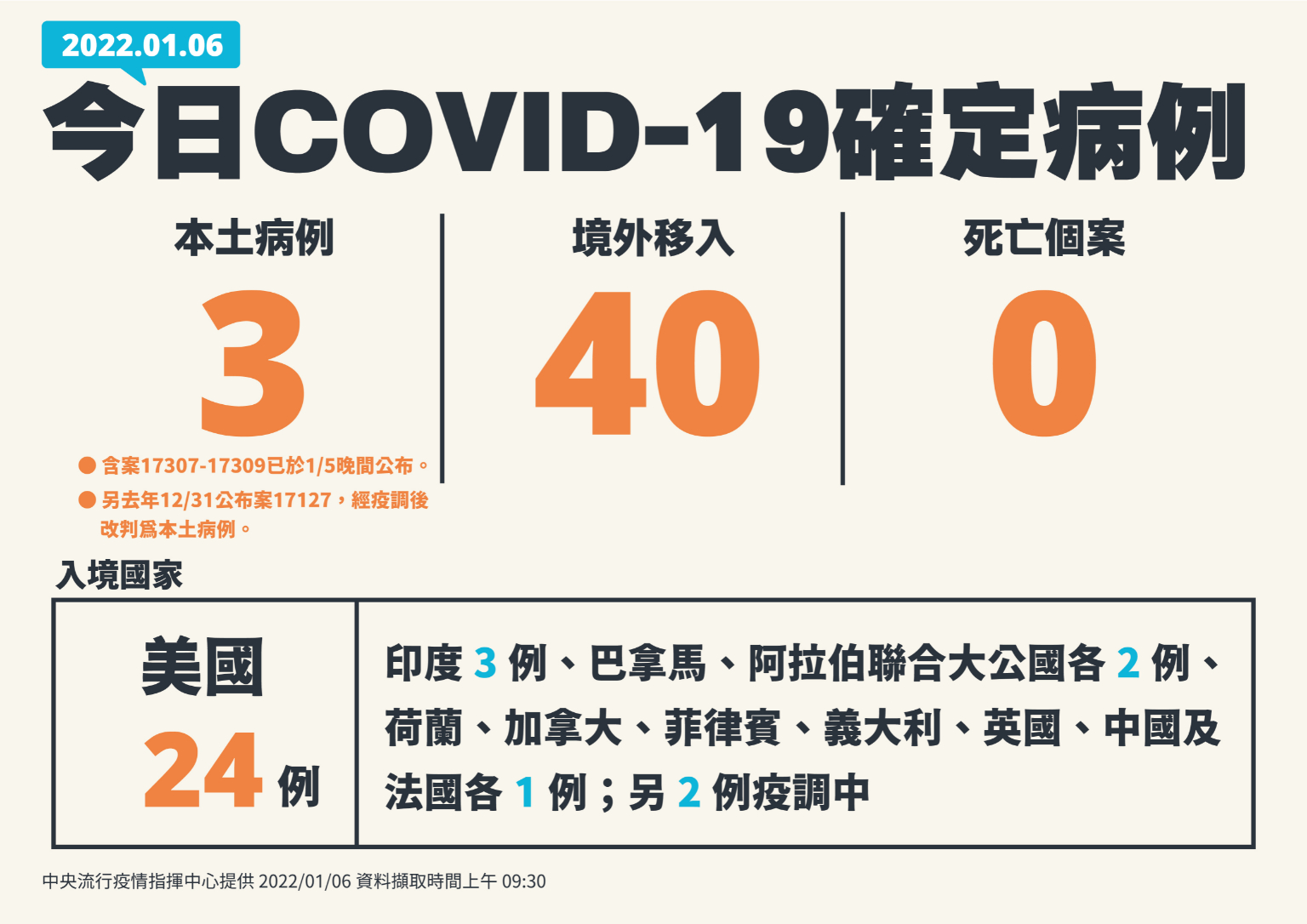 指揮中心表示,今日新增40例境外移入個案,為20例男性、20例女性,年齡介於未滿5歲至70多歲,分別自美國(24例,案17267、案17270、案17273-17275、案17277-17282、案17284-17289、案17291-17292、案17300、案17302、案17304-17306)、印度(3例,案17290、案17296、案17303)、巴拿馬(2例,案17271-17272)、荷蘭(案17268)、阿拉伯聯合大公國(2例,案17283、案17301)、加拿大(案17269)、菲律賓(案17276)、義大利(案17293)、英國(案17295)、中國(案17298)及法國(案17299)入境,另有2例(案17294、案17297)調查中,入境日介於去(2021)年12月26日至今(2022)年1月5日;詳如新聞稿附件。