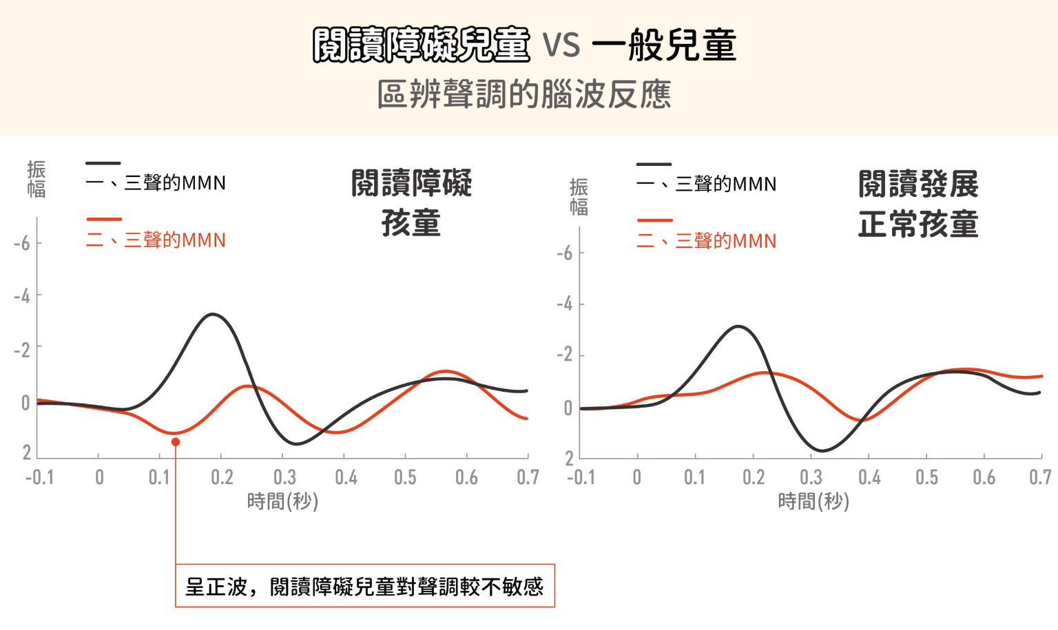 研究團隊再針對閱讀障礙的孩子做量測。結果發現,閱讀障礙孩子的 MMN 反應和低年級孩子類似,對二、三聲的 MMN 反應不敏感。這和過去認為,他們是因為看文字、視覺區辨有困難而產生閱讀障礙,有些不同!